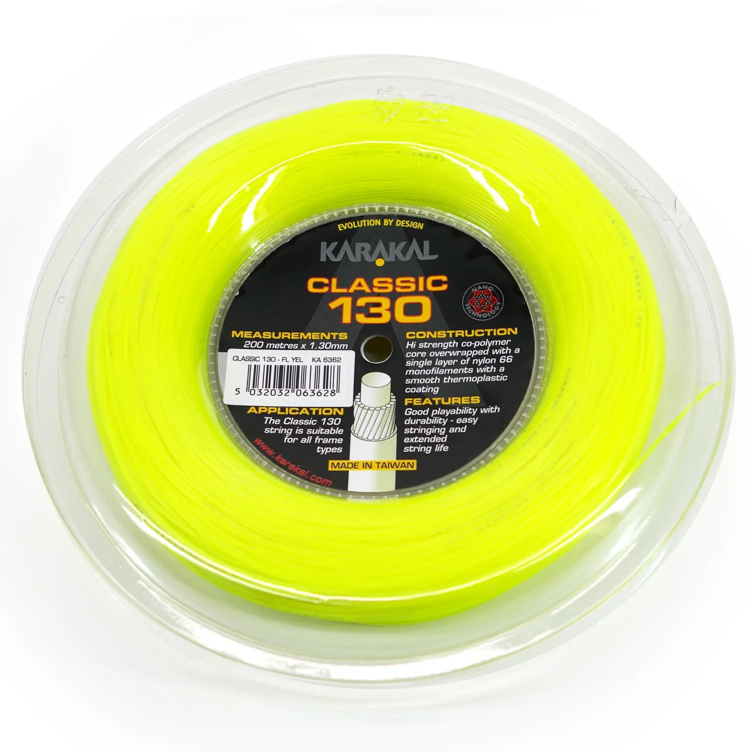 The high strength, co-polymer 1.3mm core of the Karakal Classic 130 Racket String is overwrapped with a single layer of nylon with 66 monofilaments and a smooth thermoplastic coating. This advanced technology makes the Classic 130 very strong and suitable for Racketball, Squash or Tennis.