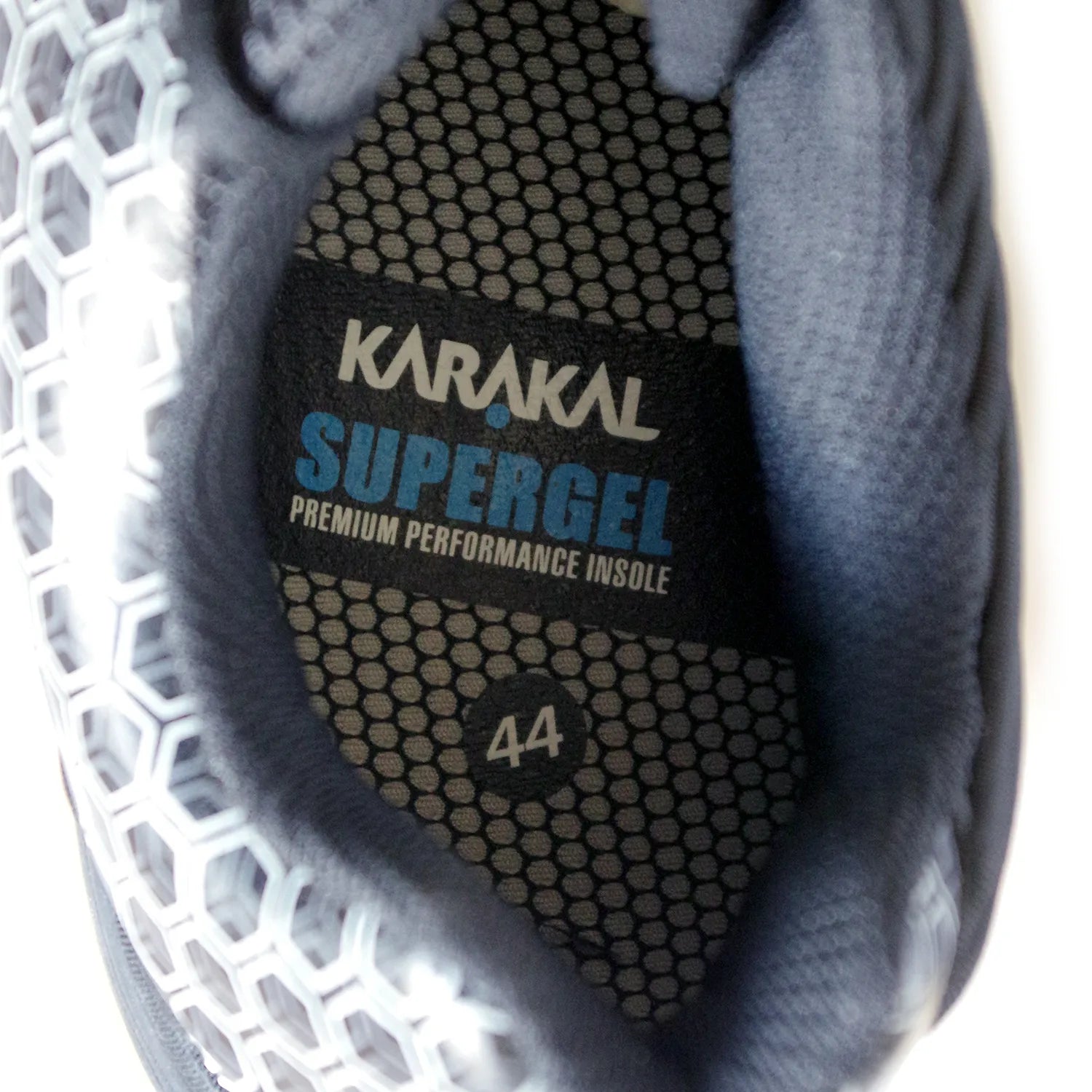- Due to the thicker 4G SuperGel Impact Comfort Insole used by Karakal, the fit may feel snug. If you're between sizes, we recommend choosing the next half size up for optimal comfort.